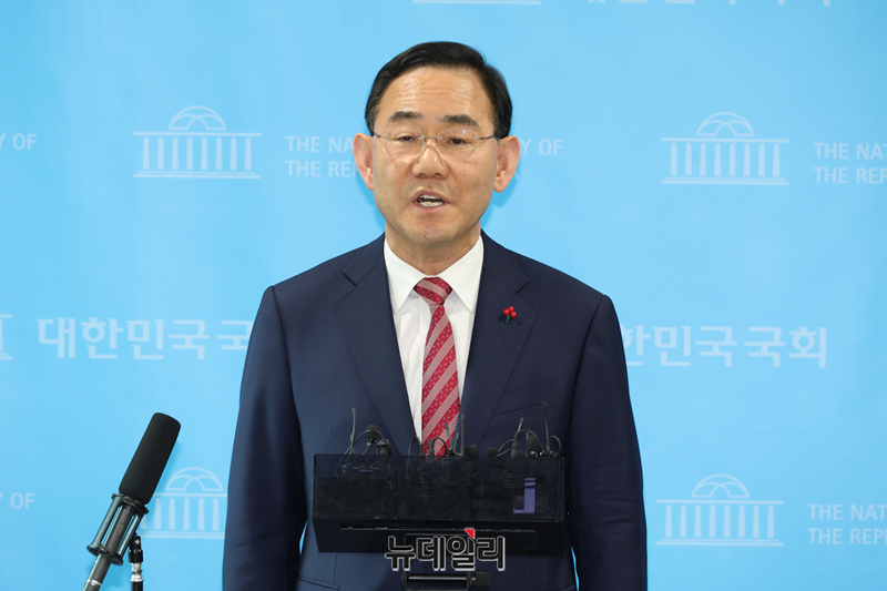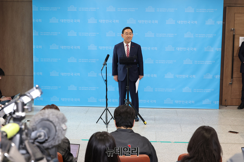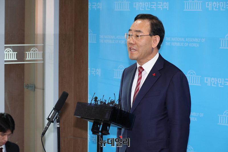 국민의힘 대구시장 후보 경선에서 공천 배제된 주호영 국회 부의장이 26일 오후 국회에서 기자회견을 열고 효력정지 가처분 신청을 제출했다고 밝힌 후 기자들의 질문에 답하고 있다.