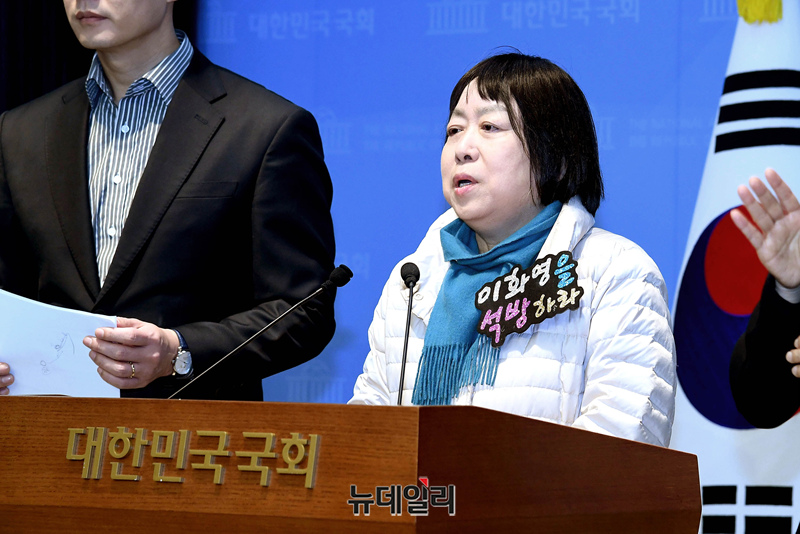 이화영 전 경기도 평화부지사의 부인 백정화 씨가 27일 국회 소통관에서 대북송금 사건 국정조사·이화영 전 부지사 석방·박상용 검사 즉각 파면 등을 촉구하는 기자회견을 하고 있다.