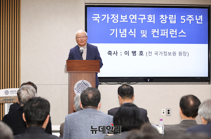 이병호 전 국가정보원장이 27일 오후 서울 종로구 세종연구소에서 열린 국가정보연구회 창립 5주년 기념식에서 축사를 하고 있다.
