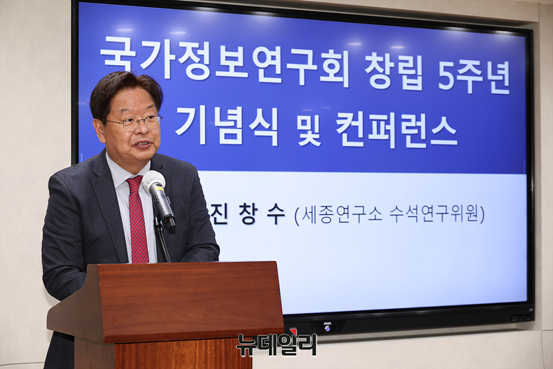 진창수 세종연구소 수석연구위원이 27일 오후 서울 종로구 세종연구소에서 열린 국가정보연구회 창립 5주년 기념식에서 축사를 하고 있다.