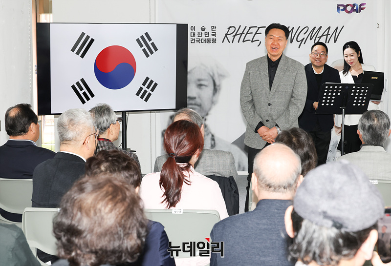 이병구 이화장 대표가 30일 오후 서울 종로구 한예극장에서 열린 이승만 탄신 151주년 기념 음악326 프로젝트 '이승만 이야기(He's Story)' 음원발매 및 해설집 출판기념 행사에서 인사말을 하고 있다.