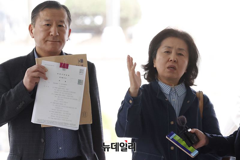 김영선 전 국회의원이 1일 서울 서초구 서울중앙지법에서 열린 오세훈 서울시장의 여론조사 대납 의혹 사건 1심 속행 공판에 증인으로 출석하며 취재진 질문에 답하고 있다.