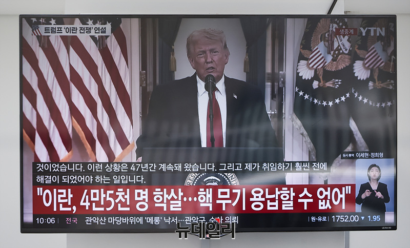 도널드 트럼프 미국 대통령의 중동 분쟁 관련 대국민 TV 연설이 진행중인 2일 오전 서울 도봉구 소재 한 가게의 TV에서 연설 장면이 송출되고 있다.