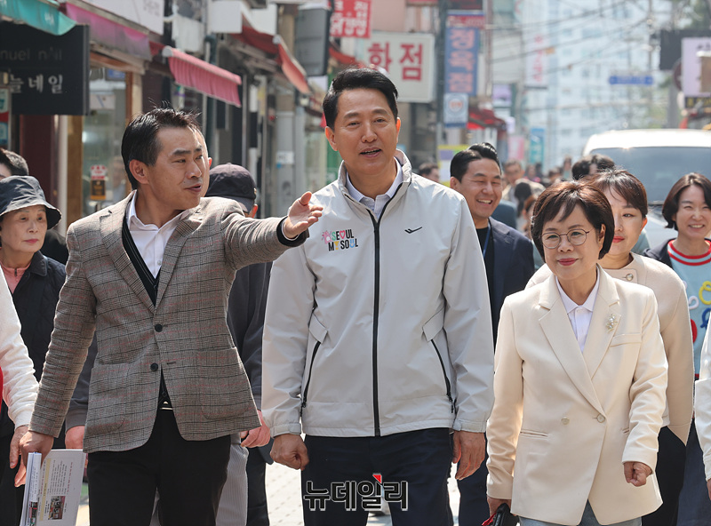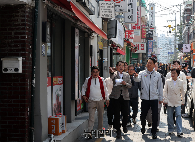 오세훈 서울시장이 2일 오전 서울 도봉구 쌍문동 쌍리단길 상권을 찾아 민행현장 방문을 하고 있다.