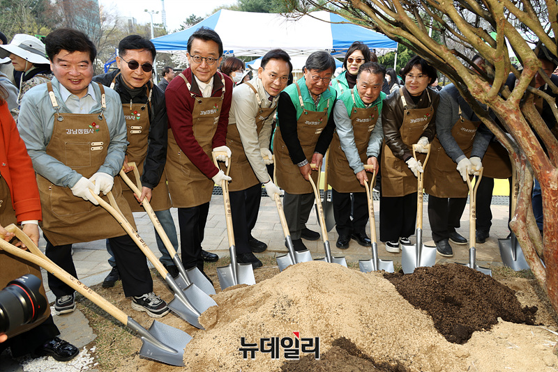 조성명 강남구청을 비롯한 참석자들이 3일 오전 서울 강남구 개포동근린공원에서 열린 '우리 동네 초록기부 챌린지 - 참여의 정원 숲 조성 행사'에서 기념식수를 하고 있다.