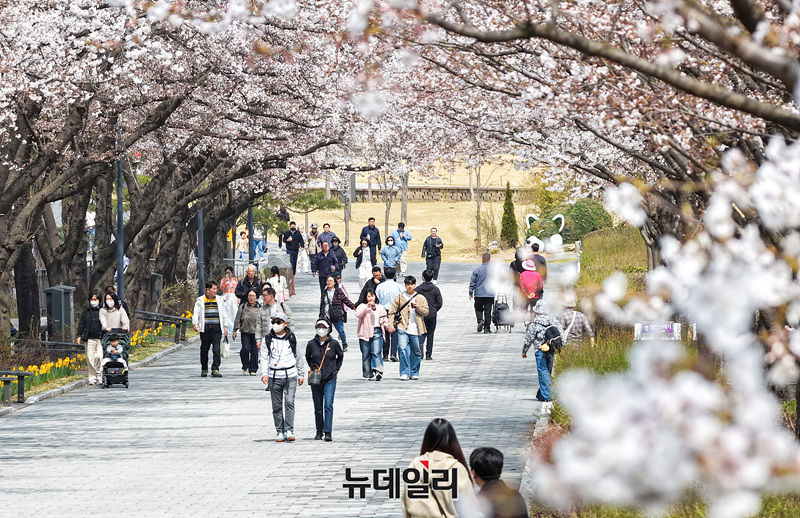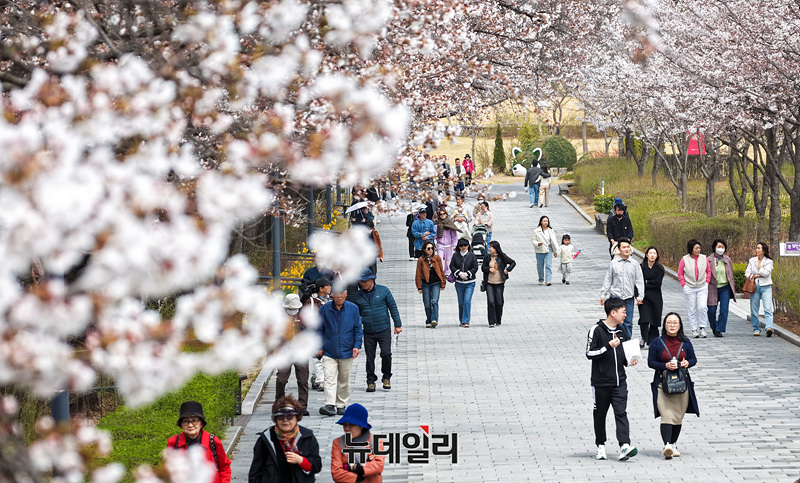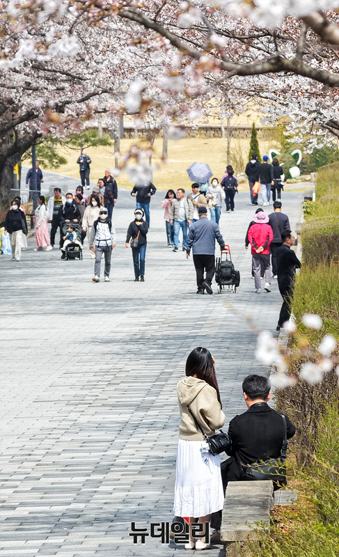 벚꽃이 만개한 3일 오후 경기 과천시의 한 공원 산책로를 찾은 시민들이 봄나들이를 즐기고 있다.