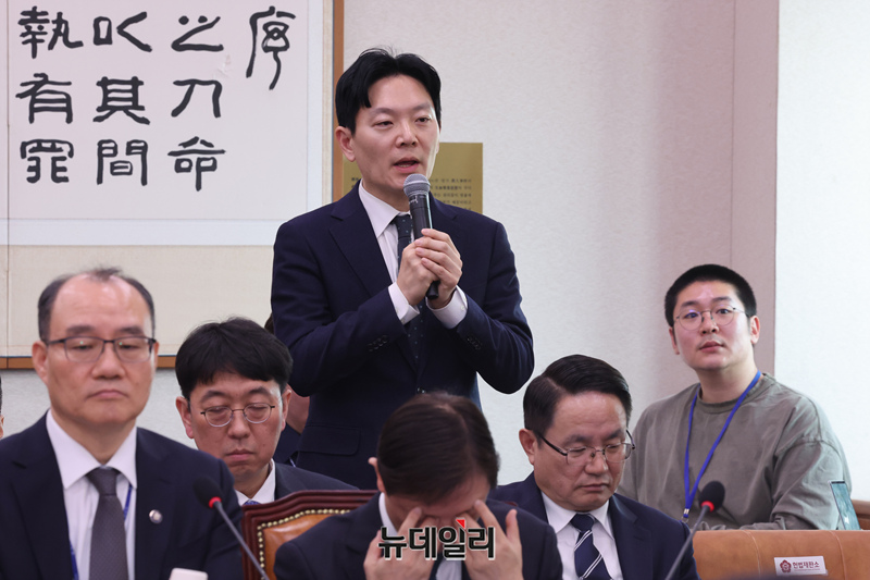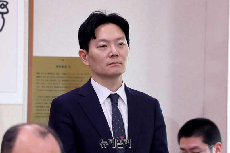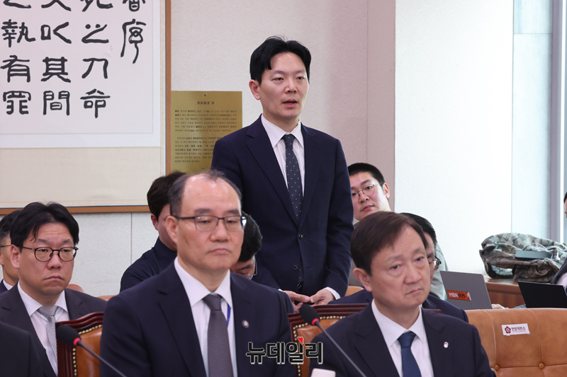 박상용 인천지검 부부장검사가 3일 국회에서 열린 윤석열 정권 정치검찰 조작기소 의혹사건 진상규명 국정조사 특별위원회 전체회의에서 증인선서를 거부한 뒤 발언권을 요청하고 있다.
