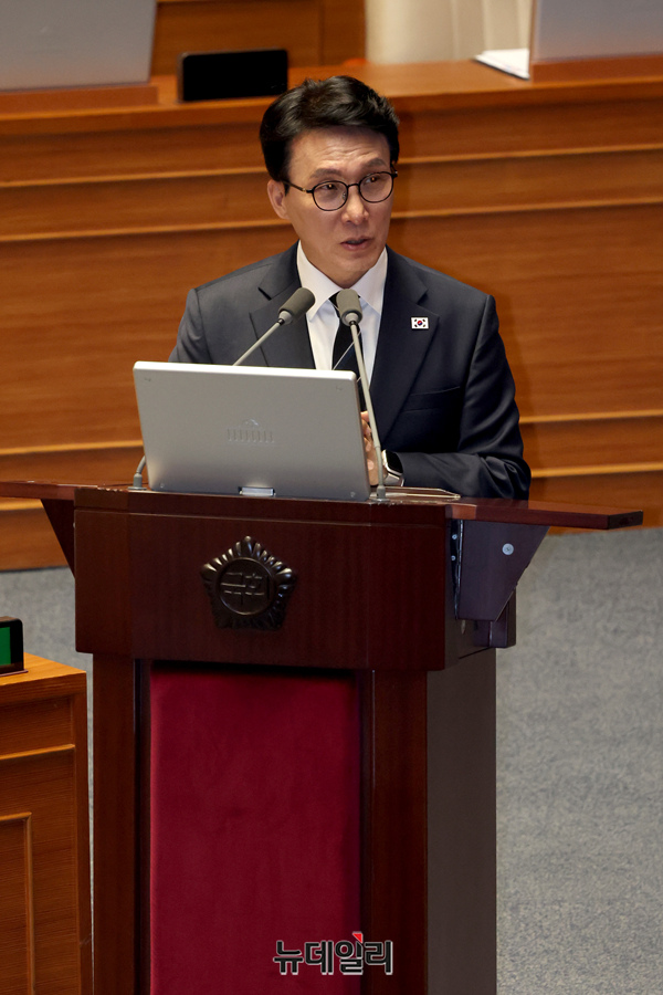 김민석 국무총리가 3일 오후 국회 본회의장에서 열린 본회의 정치·외교·통일·안보에 관한 대정부질문에서 의원들의 질문에 답하고 있다.