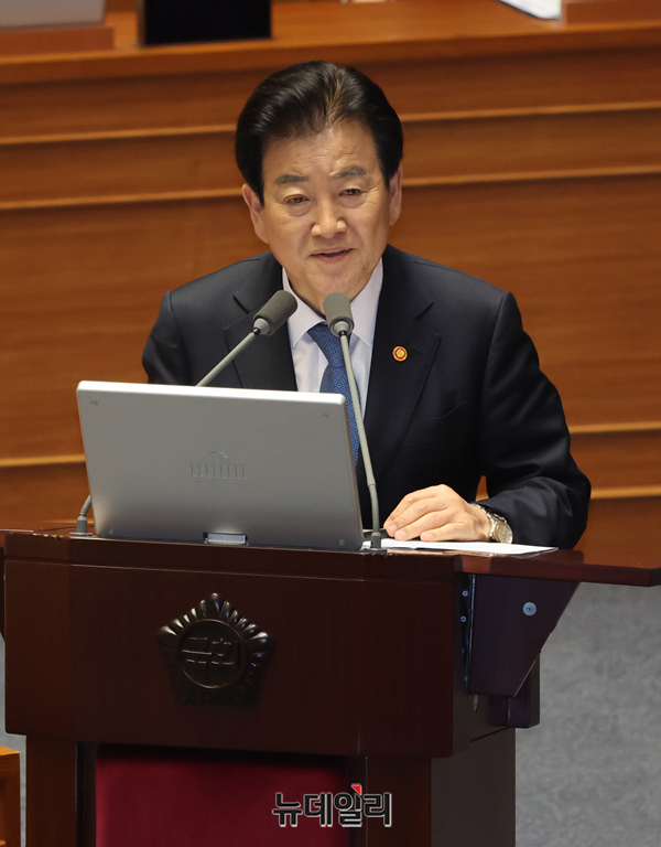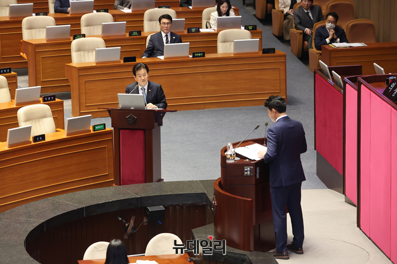 정동영 통일부 장관이 3일 오후 국회 본회의장에서 열린 본회의 정치·외교·통일·안보에 관한 대정부질문에서 의원들의 질문에 답하고 있다.
