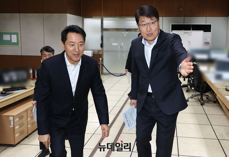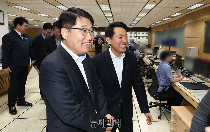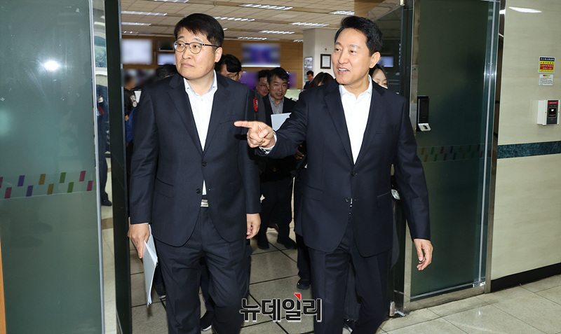 김태균 서울교통공사 사장이 6일 오전 서울 성동구 서울교통공사 제2관제센터를 찾은 오세훈 서울시장을 안내하고 있다.
