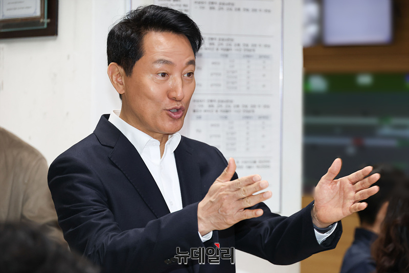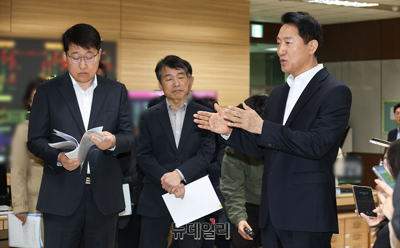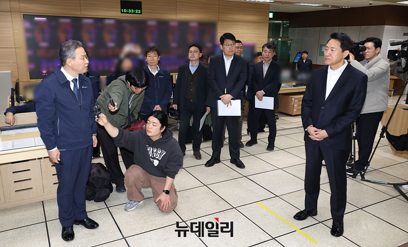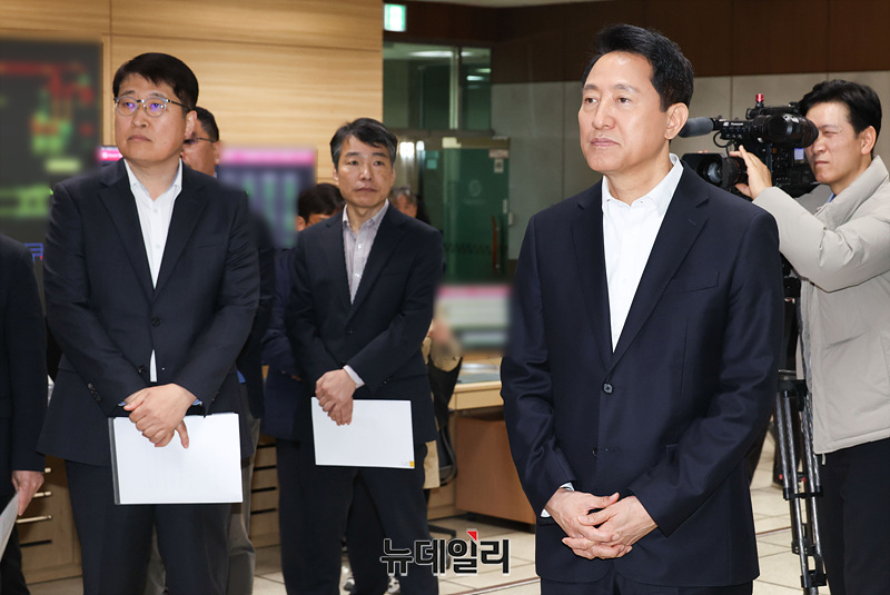 오세훈 서울시장이 6일 오전 서울 성동구 서울교통공사 제2관제센터에서 무선통신 기반 열차제어시스템(CBTC) 설명을 듣고 있다.