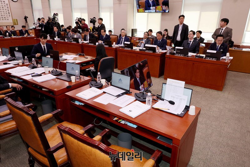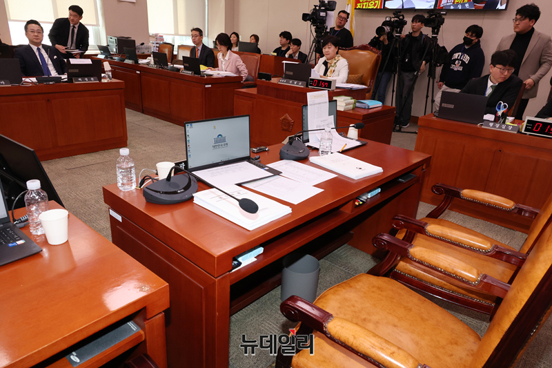 '윤석열 정권 정치검찰 조작기소 의혹사건 진상규명' 국정조사특별위원회 전체회의가 7일 국회에서 열린 가운데 회의 진행에 항의하며 퇴장한 국민의힘 의원들 좌석이 비어 있다.