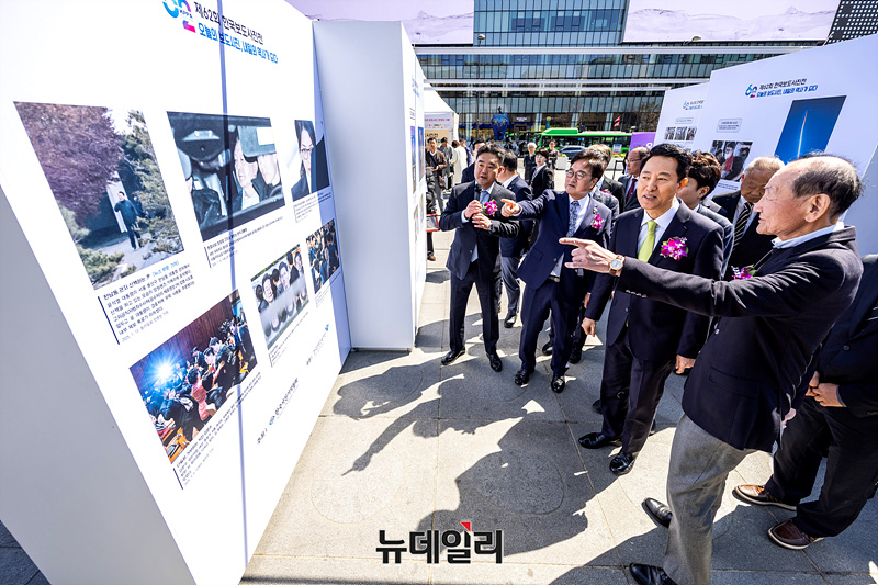 제62회 한국보도사진전 개막식이 열린 7일 서울 종로구 광화문 광장에서 우원식 국회의장, 오세훈 서울시장을 비롯한 참석자들이 작품을 관람하고 있다.