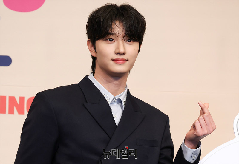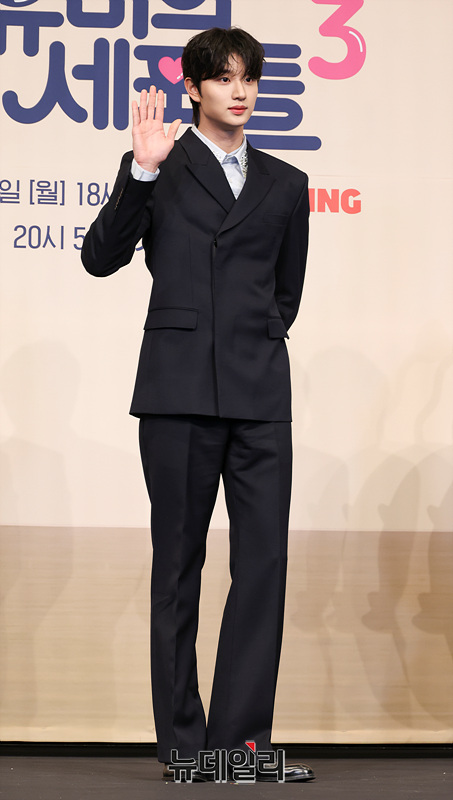 배우 김재원이 7일 오후 서울 구로구 더링크 호텔에서 열린 티빙 오리지널 시리즈 '유미의 세포들 시즌3' 제작발표회에서 포즈를 취하고 있다.