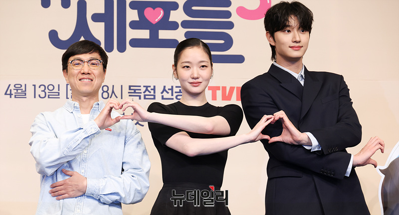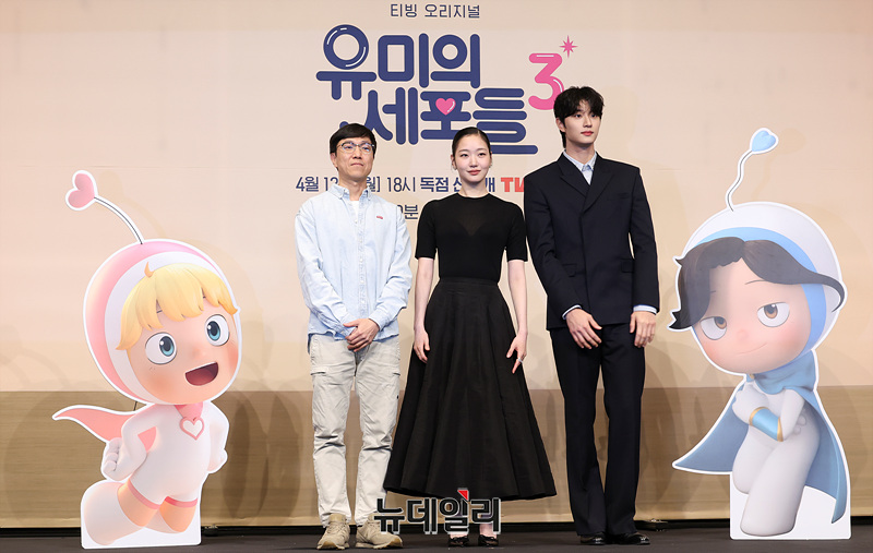 이상엽 감독, 배우 김고은, 김재원이 7일 오후 서울 구로구 더링크 호텔에서 열린 티빙 오리지널 시리즈 '유미의 세포들 시즌3' 제작발표회에서 포즈를 취하고 있다.