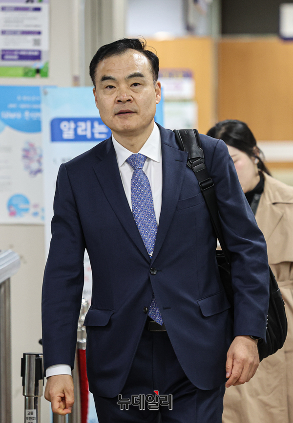 허태근 전 국방부 국방정책실장이 8일 오전 서울 서초구 서울중앙지방법원에서 열린 순직해병 수사외압 사건 관련 공판에 출석하고 있다.