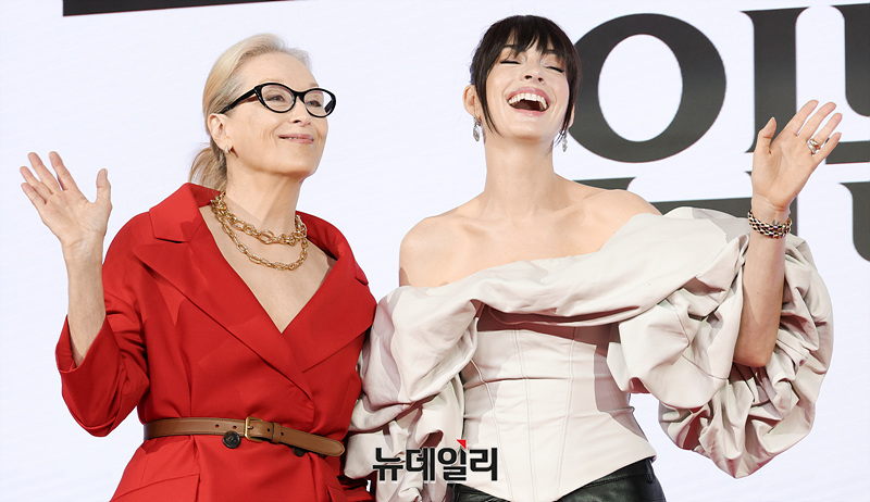 배우 메릴 스트립과 앤 해서웨이가 8일 오전 서울 중구 포시즌스 호텔에서 열린 영화 '악마는 프라다를 입는다2' 내한 기자간담회에서 포즈를 취하고 있다.영화 '악마는 프라다를 입는다2'는 급변하는 미디어 시장 속에서 '런웨이'를 지켜내려는 편집장 '미란다'와 20년 만에 신임 기획 에디터로 당당히 돌아온 '앤디', 럭셔리 브랜드 임원이 되어 다시 나타난 '에밀리'가 뉴욕 패션계에서 주도권을 차지하기 위해 벌이는 이야기를 그린다. 29일 극장 개봉.