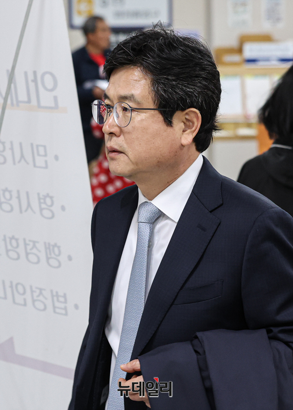 12·3 비상계엄 당시 사후 계엄선포문을 작성한 혐의를 받는 강의구 전 대통령실 부속실장이 8일 오후 서울 서초구 서울중앙지방법원에서 열린 공판에 출석하고 있다.