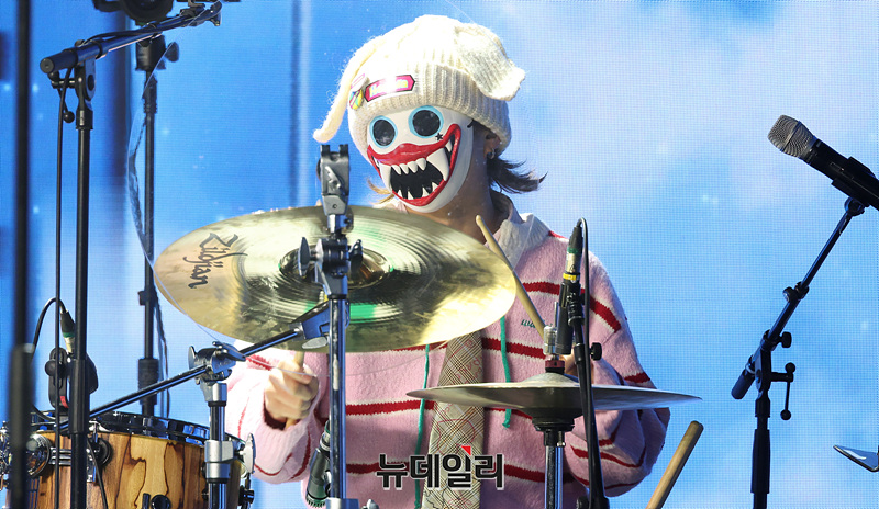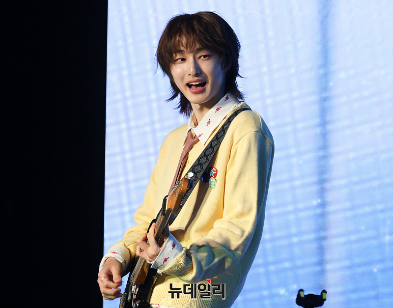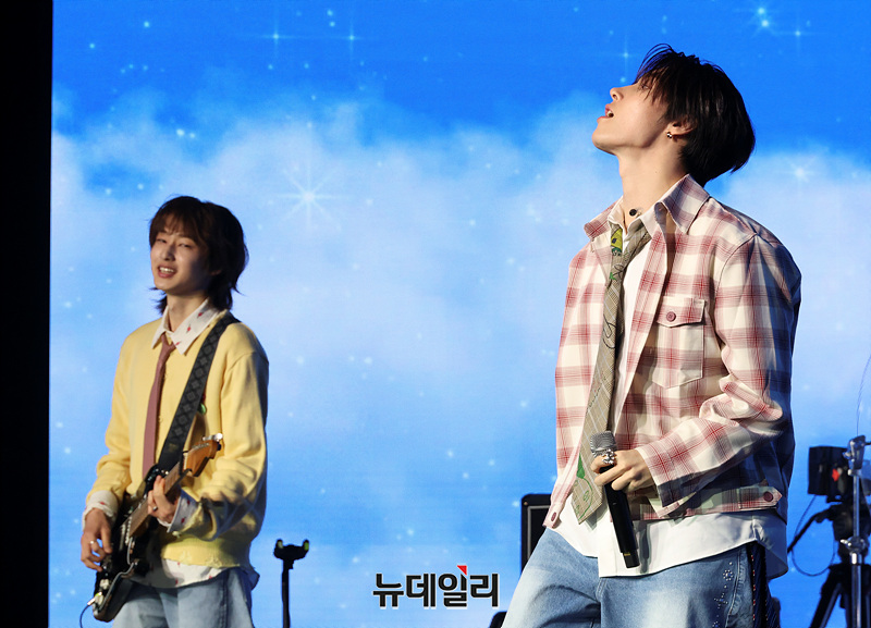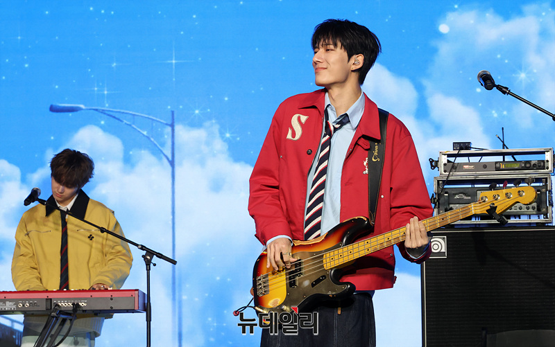밴드 하츠웨이브(hrtz.wav)가 8일 오후 서울 마포구 문화비축기지 공연장에서 열린 미니 1집 '더 퍼스트 웨이브(The First Wave)' 발매 기념 미디어 쇼케이스에서 무대를 선보이고 있다.
