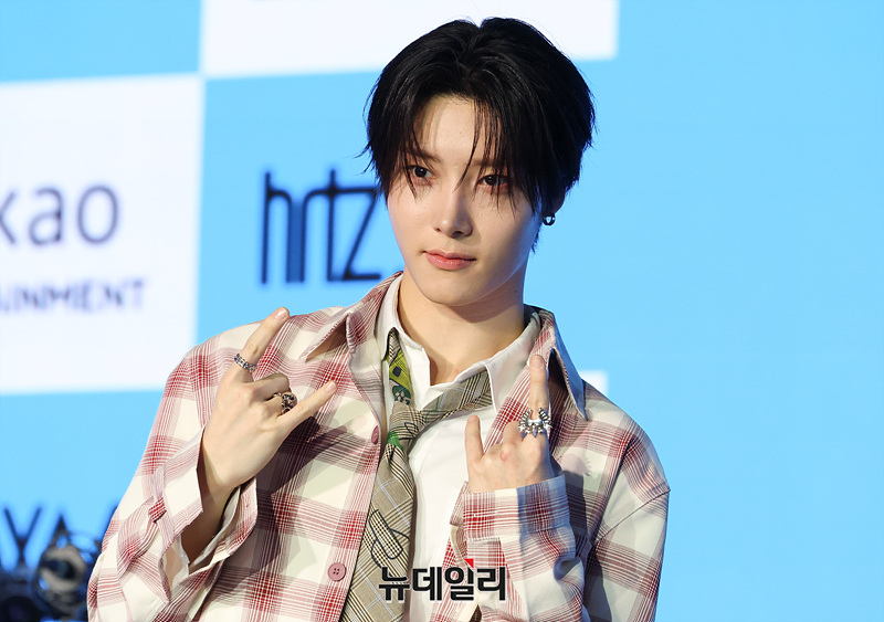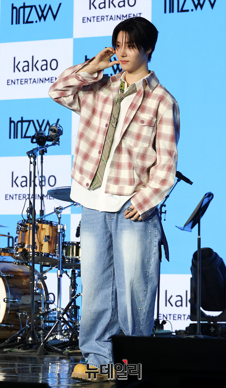 밴드 하츠웨이브(hrtz.wav) 리안이 8일 오후 서울 마포구 문화비축기지 공연장에서 열린 미니 1집 '더 퍼스트 웨이브(The First Wave)' 발매 기념 미디어 쇼케이스에서 포즈를 취하고 있다.