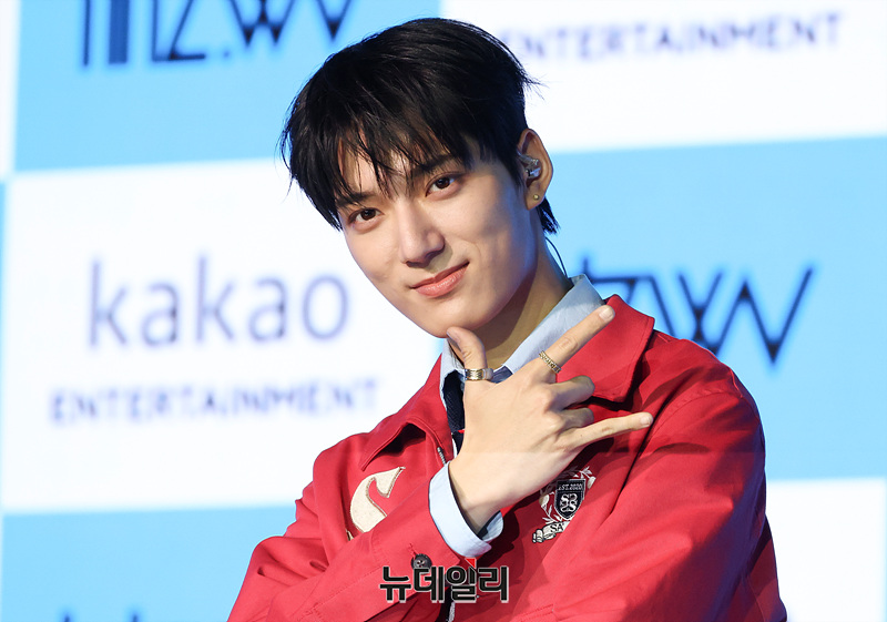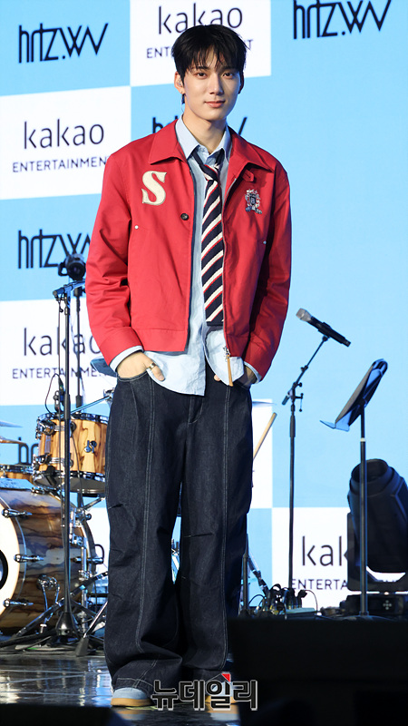 밴드 하츠웨이브(hrtz.wav) 데인이 8일 오후 서울 마포구 문화비축기지 공연장에서 열린 미니 1집 '더 퍼스트 웨이브(The First Wave)' 발매 기념 미디어 쇼케이스에서 포즈를 취하고 있다.