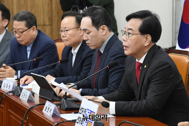 송언석 국민의힘 원내대표가 9일 오전 국회에서 열린 최고위원회의에 참석해 모두발언을 하고 있다.