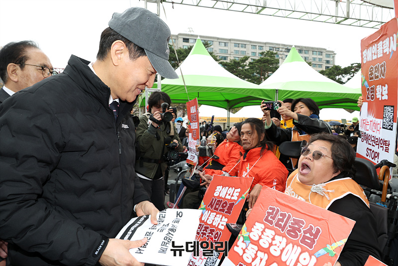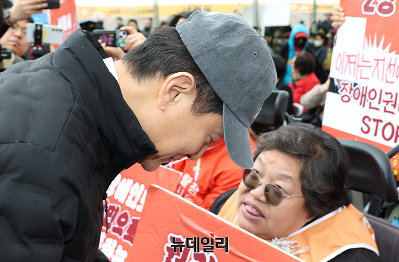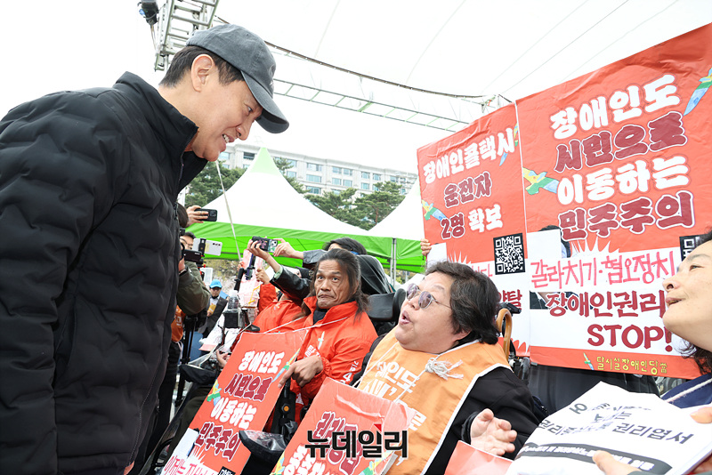 오세훈 서울시장과 전국장애인차별철폐연대(전장연)가 창당한 '탈시설장애인당' 관계자들이 9일 오전 서울 여의도 광장에서 열린 2026 동행서울 누리축제에서 대화를 나누고 있다.