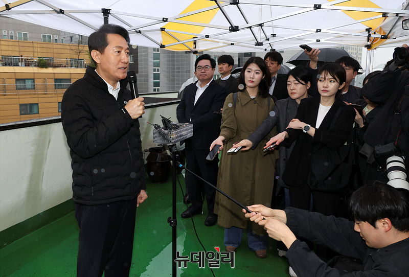 오세훈 서울시장이 9일 오후 서울 동작구 신대방삼거리역 역세권 활성화사업구역 현장방문을 마치며 발언하고 있다.
