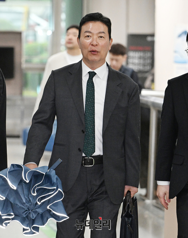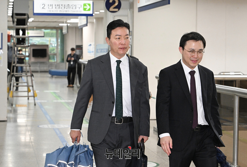 윤석열 전 대통령 체포방해 혐의를 받는 김성훈 전 대통령경호처 차장이 9일 오후 서울 서초구 서울중앙지방법원에서 열린 공판에 출석하고 있다.