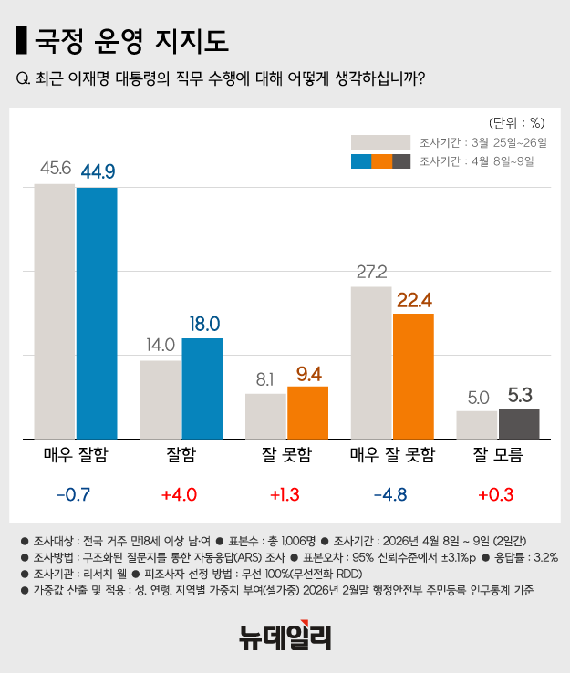 이재명 대통령의 국정 지지도가 62.9%를 기록했다는 여론조사 결과가 10일 나왔다.뉴데일리 의뢰로 여론조사기관 '리서치웰'이 지난 8~9일 전국 만 18세 이상 남녀 1006명을 대상으로 이 대통령의 직무 수행에 대해 물은 결과 '긍정 평가'가 3월 4주 직전 조사보다 3.3%포인트 오른 62.9%로 나타났다. '부정 평가'는 직전 대비 3.5%포인트 하락한 31.8%다.구체적으로 보면 '매우 잘함'은 44.9%, '잘하는 편'은 18.0%, '잘못하는 편'은 9.4%, '매우 잘못함'은 22.4%로 집계됐다. '잘 모름'은 5.3%다.'긍정 평가'는 40대(75.2%), 호남 지역(85.4%)에서 상대적으로 높게 나타났다. '부정 평가'는 30대(52.2%), 대구·경북(39.8%)에서 높게 형성됐다.