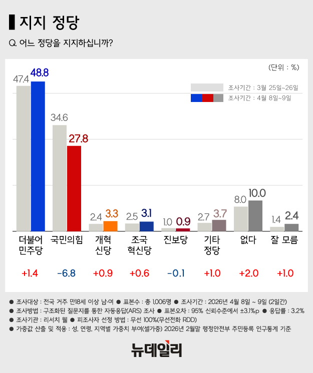 정당 지지도 조사에서는 더불어민주당이 48.8%, 국민의힘이 27.8%로 나타났다. 직전 조사보다 민주당은 1.4%포인트 올랐고 국민의힘은 6.8%포인트 떨어졌다.이어 조국혁신당 3.1%, 개혁신당 3.3%, 진보당 0.9%, 기타 3.7%, 없음 10.0%, 잘 모름 2.4%다.국민의힘 지지도는 대구·경북(44.6%)을 제외한 모든 지역에서 민주당보다 상대적으로 낮았다.이번 조사는 구조화된 질문지를 이용한 무선 전화(100%) 자동응답(ARS) 방식으로 실시됐다. 표본오차는 95% 신뢰수준에서 ±3.1%포인트, 응답률은 3.2%다.자세한 내용은 중앙선거여론조사심의위원회 홈페이지에서 확인할 수 있다.
