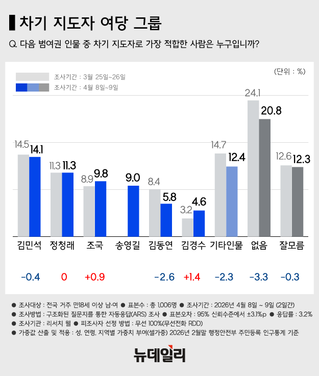 범여권 차기 지도자 적합도 조사에서 김민석 국무총리와 정청래 더불어민주당 대표, 조국 조국혁신당 대표, 송영길 전 민주당 대표가 오차 범위 내에서 4강 구도를 형성하는 것으로 10일 나타났다. 범야권에서는 장동혁 국민의힘 대표와 한동훈 전 국민의힘 대표가 선두 자리를 놓고 비슷한 지지율을 보였다.뉴데일리 의뢰로 여론조사기관 '리서치웰'이 지난 8~9일 전국 거주 만 18세 이상 남녀 1006명을 대상으로 '범여권 차기 지도자 적합도'를 조사한 결과 김 총리는 3월 4주 조사 대비 0.4%포인트 하락한 14.1%를 기록했다.이어 정청래 대표가 직전 조사와 같은 11.3%로 나타났다. 조국 대표는 0.9%포인트 오른 9.8%로 집계됐다.리서치웰 조사에서 이번에 처음 등장한 송영길 전 대표는 9.0%로 조사됐다. 이어 김동연 경기도지사 5.8%(2.6%포인트↓), 김경수 경남도지사 예비후보는 4.6%(1.4%포인트↑)다.적합한 인물이 '없음'이라고 응답한 비율은 20.8%였고, '기타 인물'은 12.4%, '잘 모르겠다'는 12.3%로 나타났다.