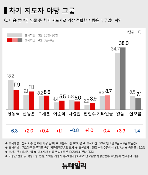 범야권 차기 지도자 적합도 조사에서는 장동혁 대표가 11.9%로 직전 조사 대비 6.3%포인트 하락했다. 이어 한동훈 전 대표가 지난 조사보다 2.0%포인트 오른 11.1%로 장 대표와 비슷하게 나왔다.오세훈 서울시장은 0.4%포인트 상승한 8.6%, 이준석 개혁신당 대표는 5.5%(1.1%포인트↑), 나경원 국민의힘 의원 5.0%(0.8%포인트↓), 안철수 국민의힘 의원은 3.9%(1.0%포인트↑)로 집계됐다.'없음'은 38.0%였고, '기타 인물'은 8.7%, '잘 모르겠다'는 응답은 7.1%로 나타났다.