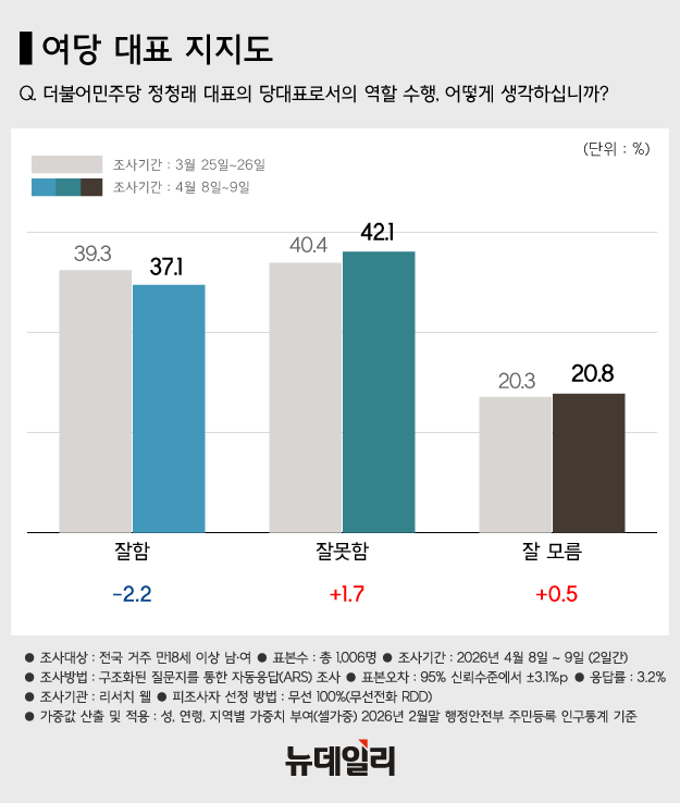 정청래 지지도 긍정 37.1% vs 부정 42.1%장동혁 지지도 긍정 21.3% vs 부정 63.9%