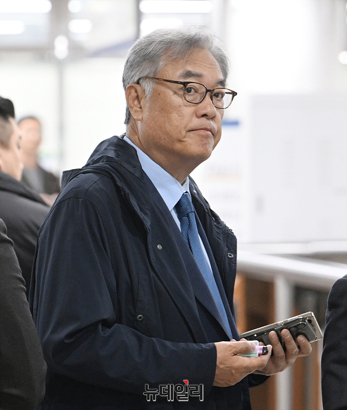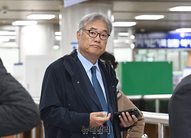 헌법재판관 미임명과 졸속 지명 등 혐의로 기소된 정진석 전 대통령비서실장이 10일 오전 서울 서초구 서울중앙지방법원에서 열린 공판에 출석하고 있다.