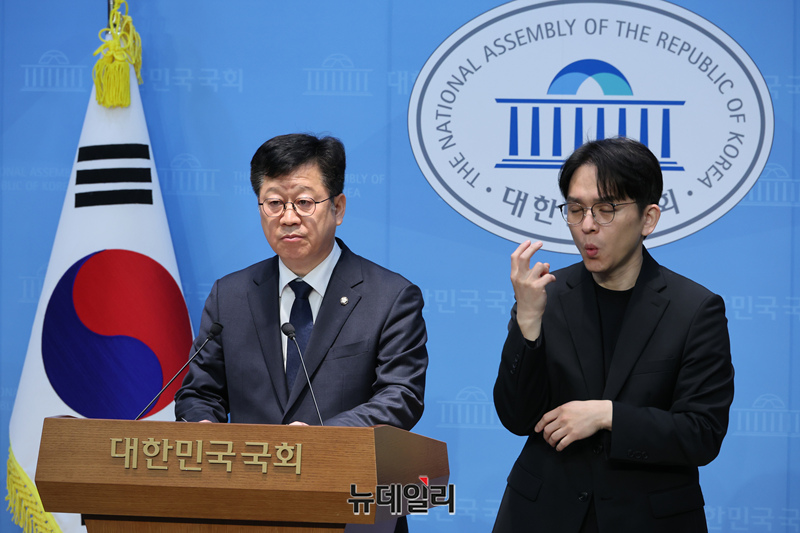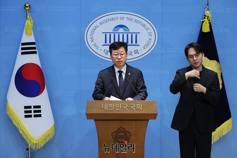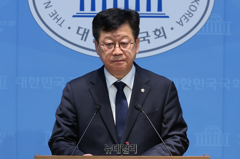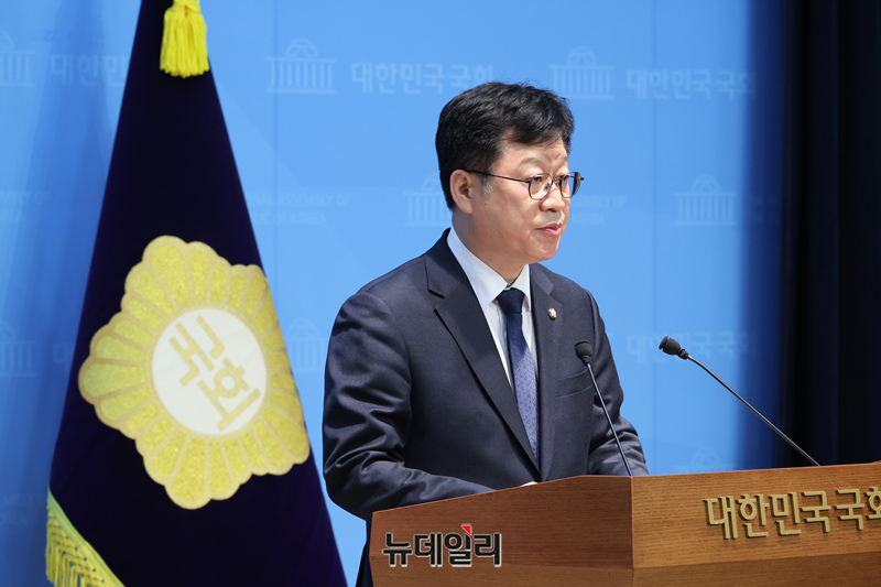 안호영 더불어민주당 전북지사 예비후보가 10일 오전 국회 소통관에서 기자회견을 갖고 경쟁 상대인 이원택 의원의 식비 대납 의혹에 대한 재감찰을 요구하고 있다.