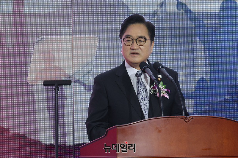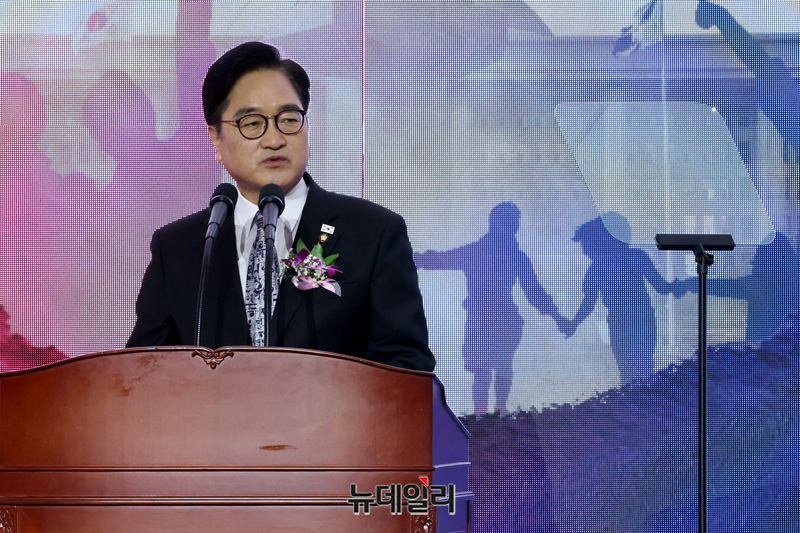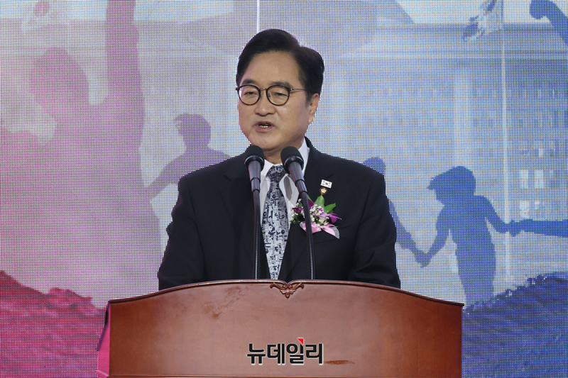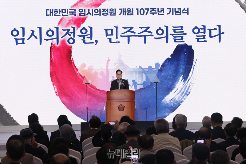 우원식 국회의장이 10일 오전 국회에서 열린 임시의정원 개원 107주년 기념식에서 기념사를 하고 있다.