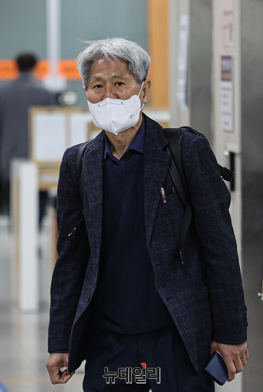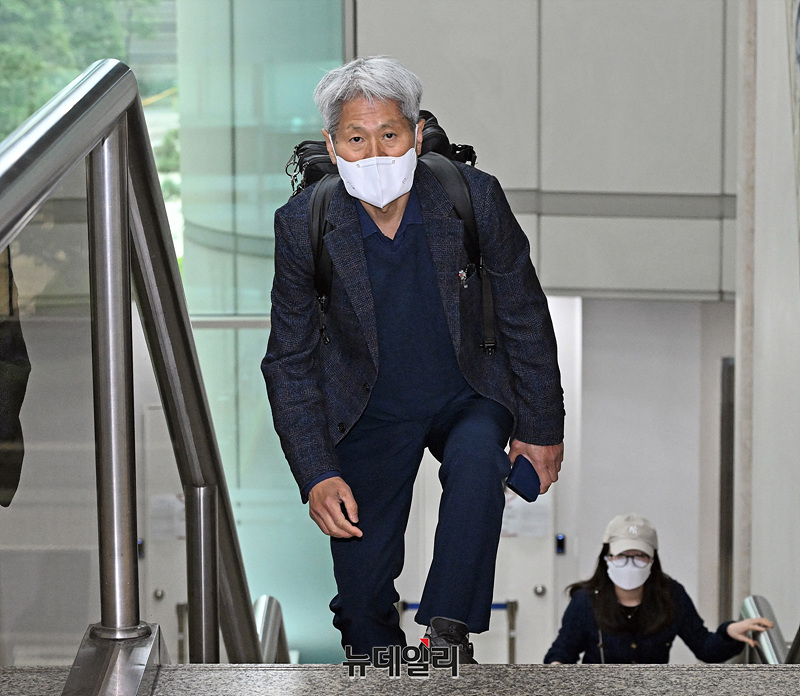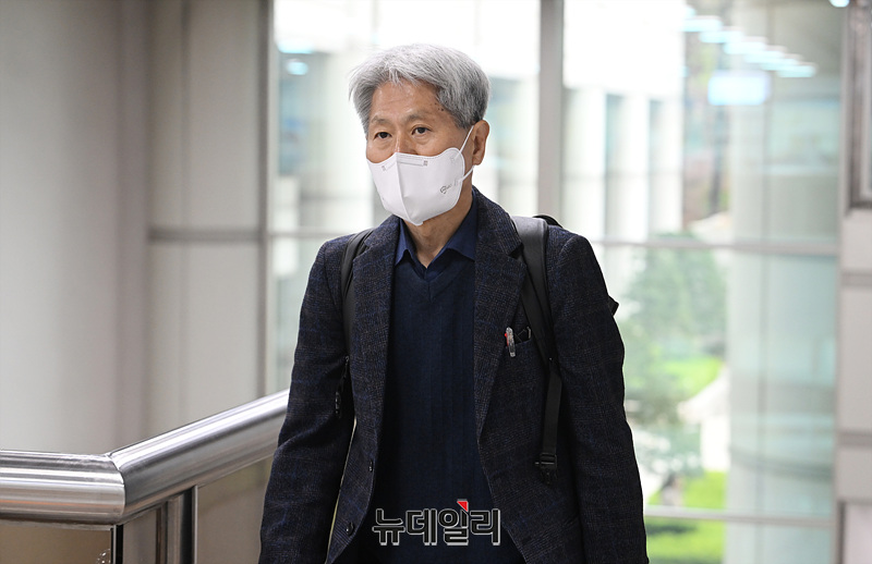 신학림 전 언론노조위원장이 10일 서울 서초구 서울중앙지방법원에서 열린 윤석열 명예훼손 허위보도 의혹 관련 재판에 출석하고 있다.