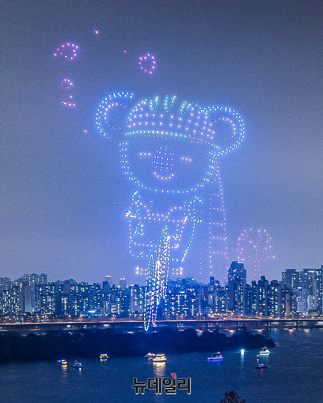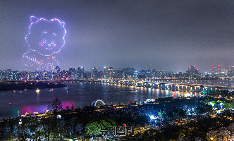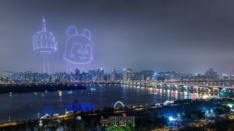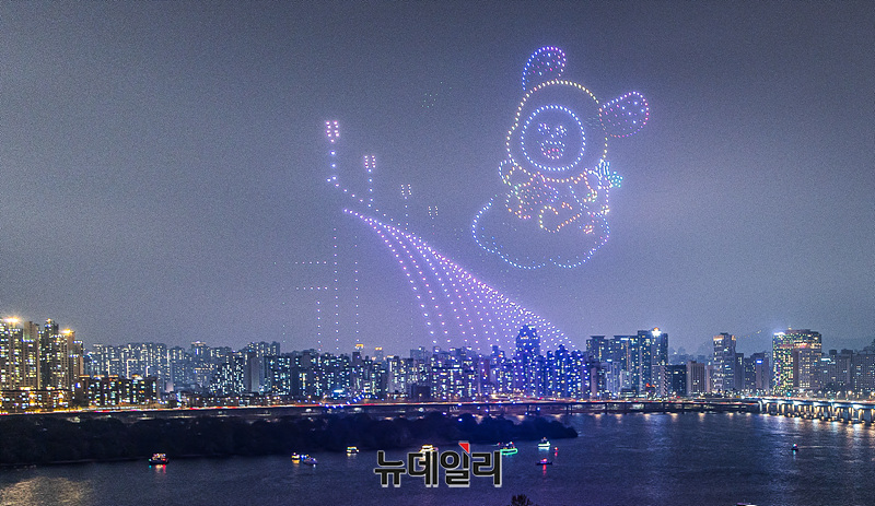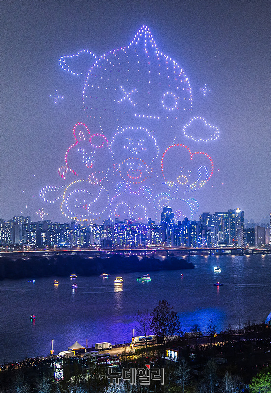방탄소년단과 라인프렌즈가 함께 탄생시킨 캐릭터 브랜드 '우주스타 BT21' 테마 2026 한강 드론 라이트쇼가 10일 오후 서울 여의도 한강공원에서 진행되고 있다.