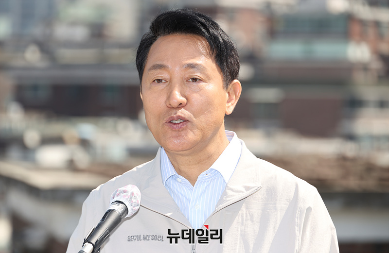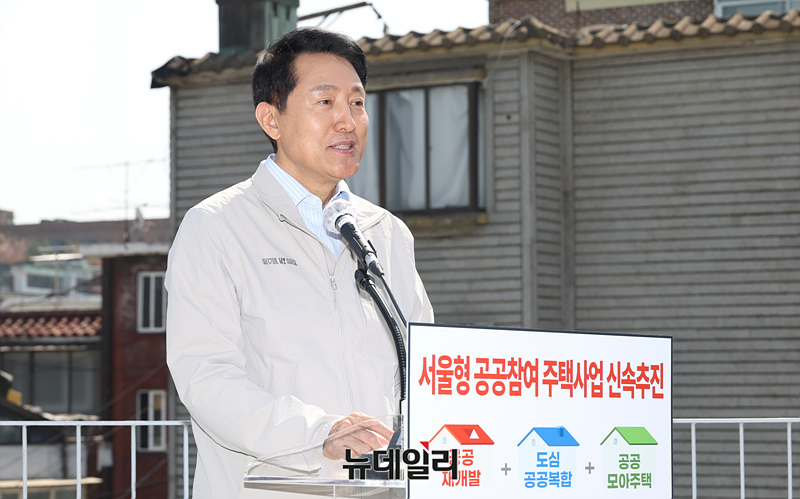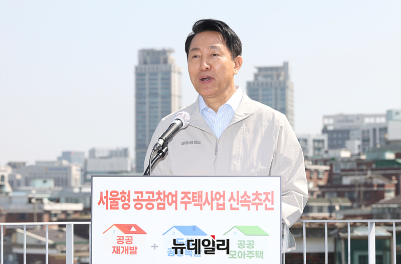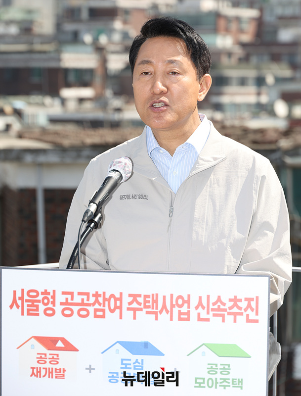 오세훈 서울시장이 13일 오전 서울형 공공참여 주택사업과 관련해 공공재개발 방식으로 정비사업을 추진 중인 서울 마포구 아현1구역 현장을 방문해 방안을 발표하고 있다.