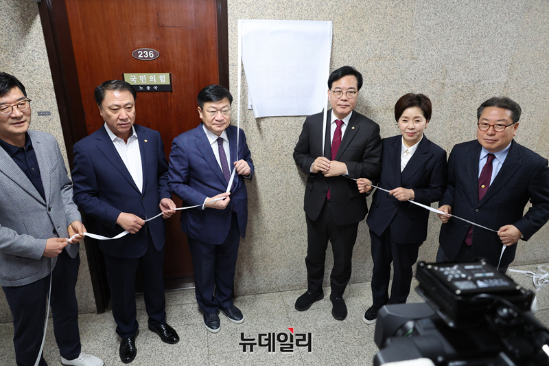 송언석 국민의힘 원내대표와 정점식 정책위의장 등이 13일 국회 국민의힘 노동국에서 '노란봉투법 권익보호신고센터' 현판 제막을 하고 있다.