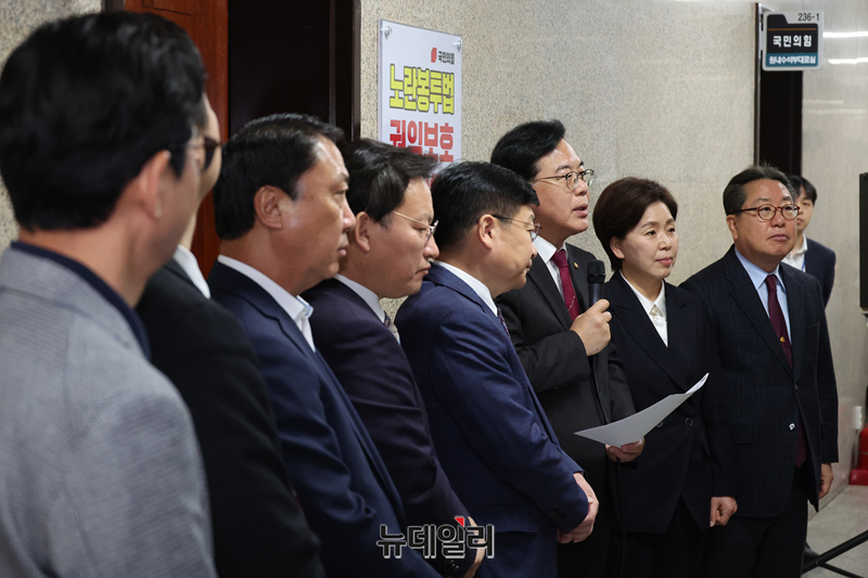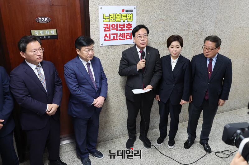 송언석 국민의힘 원내대표가 13일 국회 국민의힘 노동국에서 '노란봉투법 권익보호신고센터' 현판 제막식에서 발언을 하고 있다.