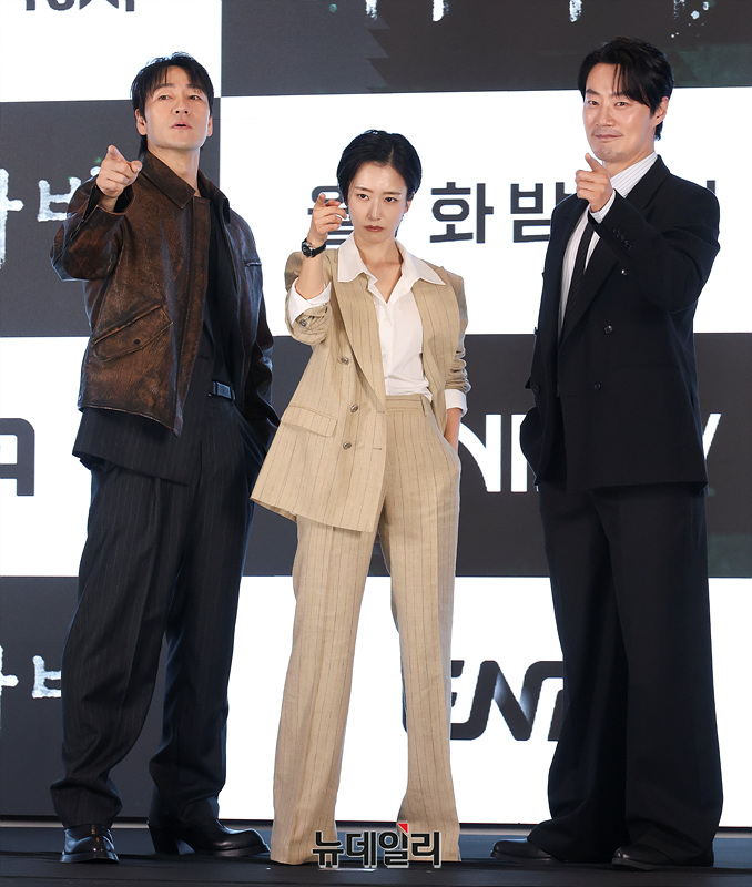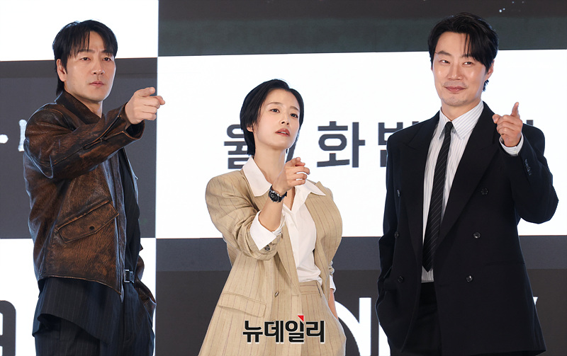 배우 박해수, 곽선영, 이희준이 13일 오후 서울 구로구 더 세인트에서 열린 ENA 새 월화드라마 '허수아비' 제작발표회에서 포즈를 취하고 있다.