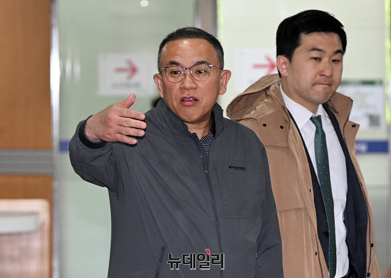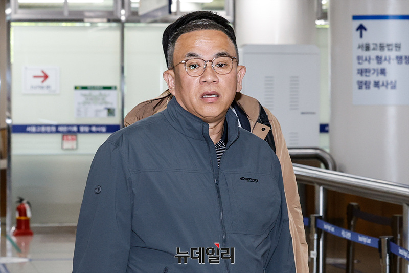 정치브로커 명태균 씨가 14일 오전 서울 서초구 서울중앙지방법원에서 열린 정치자금법 위반 혐의 관련 공판에 출석하고 있다.