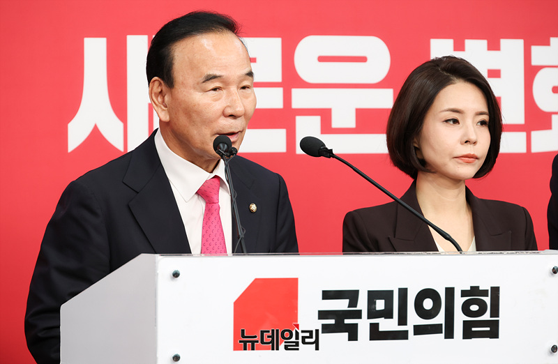 박덕흠 국민의힘 공천관리위원장이 14일 오전 서울 여의도 국민의힘 중앙당사에서 경선 결과를 발표하고 있다.