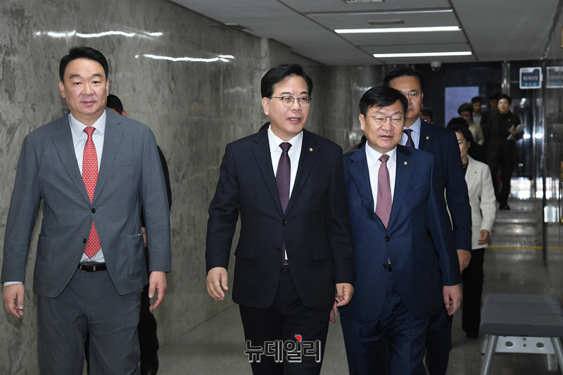 송언석 국민의힘 원내대표가 14일 오전 국회에서 열린 원내대책회의에 참석하고 있다.