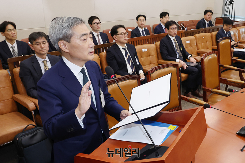 신현송 한국은행 총재 후보자가 15일 오전 국회 재정경제기획위원회에서 열린 인사청문회에서 선서를 하고 있다.