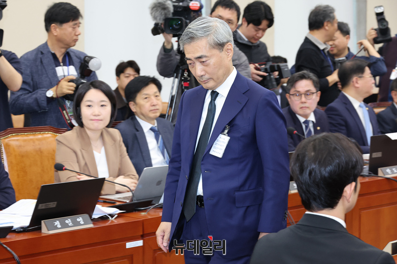 신현송 한국은행 총재 후보자가 15일 오전 국회 재정경제기획위원회에서 열린 인사청문회에서 선서문을 제출한 후 자리고 돌아가고 있다.