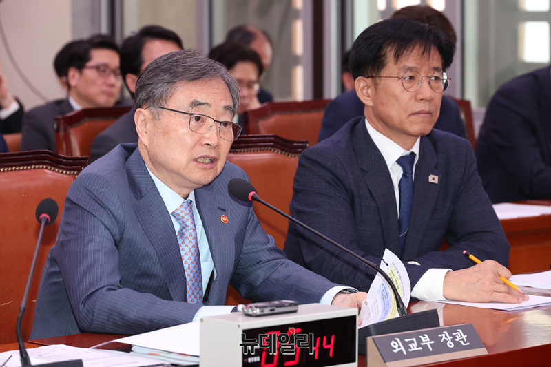 조현 외교부 장관이 15일 오전 국회에서 열린 외교통일위원회 전체회의에서 의원들의 질문에 답하고 있다.