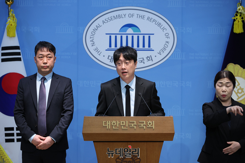 유튜브 채널 백브리핑 운영자 백광현 씨가 16일 오후 국회 소통관에서 남욱-유동규 간의 통화 녹취록 공개 기자회견을 하고 있다.